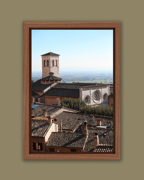 This photo taken in Assisi, Italy by Photographer and Digital Artist, Scott Allen Wilson, shows the Abbey of Saint Peter from a hill. The landscape fades away in the background creating a magic painting effect. The tower of the Abbey stands out contrasting with a sky full of light. If you have a wooden interior design, the earthy colors of this print could complement perfectly. The print has been realized on glossy Fuji Crystal Archive paper, and mounted beneath acrylic glass. It is displayed underneath a matte float glass, and surrounded by a beautiful walnut floater frame. Every element of this piece was individually selected with intention as being a part of a unified piece of art.