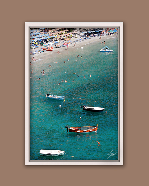 Take a glimpse at Monterosso al Mare, in Cinque Terre, Liguria. Relax on the beach with little sunbeds, people soaking up the sun, and colorful boats dotting the sea. Bring a piece of the italian summer to your home all year long with this print by Photographer Scott Allen Wilson! The print has been realized on glossy Fuji Crystal Archive paper and mounted beneath acrylic glass. The mounted print is surrounded by a beautiful white solid wood floater frame. All the elements in this composition were carefully picked to create the perfect print that transports you to Cinque Terre.