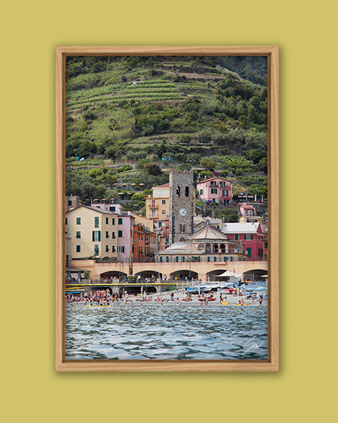 The coastline of Monterosso al Mare, Cinque Terre, is a feast for the eyes. The clear blue water reflects the warm and vivid hues of the houses overlooking the beach, green vineyards looming over it. Italians and tourists crowd the beautiful seaside and make this print come to life. The print has been realized on glossy Fuji Crystal Archive paper and mounted beneath acrylic glass. The mounted print is surrounded by a beautiful natural oak floater frame. All the elements in this composition were carefully picked to create the perfect print that transports you to Cinque Terre.