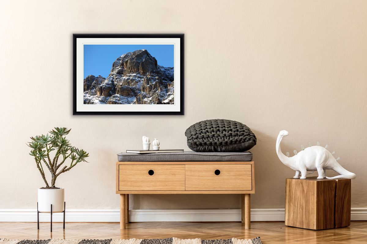 The rocky and rough texture of this picture contrasts with the smooth blue sky in the background. The rhythm created in the snow by the lines of erosion transmits dynamism and allows us to appreciate the beauty of natural formations. This close-up of a snow-capped mountain was taken in The Dolomites, Italy by Photographer and Digital Artist, Scott Allen Wilson. The finished work of art has been realized on Hahnemühle FineArt Pearl paper and mounted with a natural white passe-partout. The mounted print is displayed underneath a matte float glass and surrounded by a beautiful ebony solid wood frame. Hang this print in your room to bring textures and movement to your decoration.