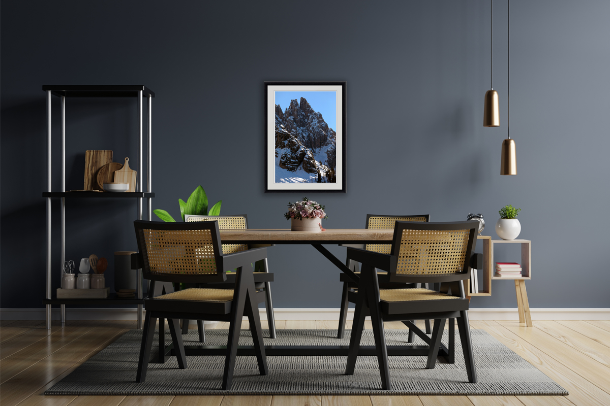 Appreciating its intimidating enormity, this rocky mountain in the Dolomites, Italy was captured by Photographer and Digital Artist, Scott Allen Wilson with the purpose of making us feel for a moment the imposing experience of standing under the shadow of a giant. This framed print can be the perfect decorative element for those spaces that seek to express a message, that look for meaning. The print has been realized on Hahnemühle FineArt Pearl paper and mounted with a natural white passe-partout. The mounted print is displayed underneath a matte float glass and surrounded by a beautiful ebony solid wood frame. Make this print a part of your home and enjoy a permanent window to the Dolomites.