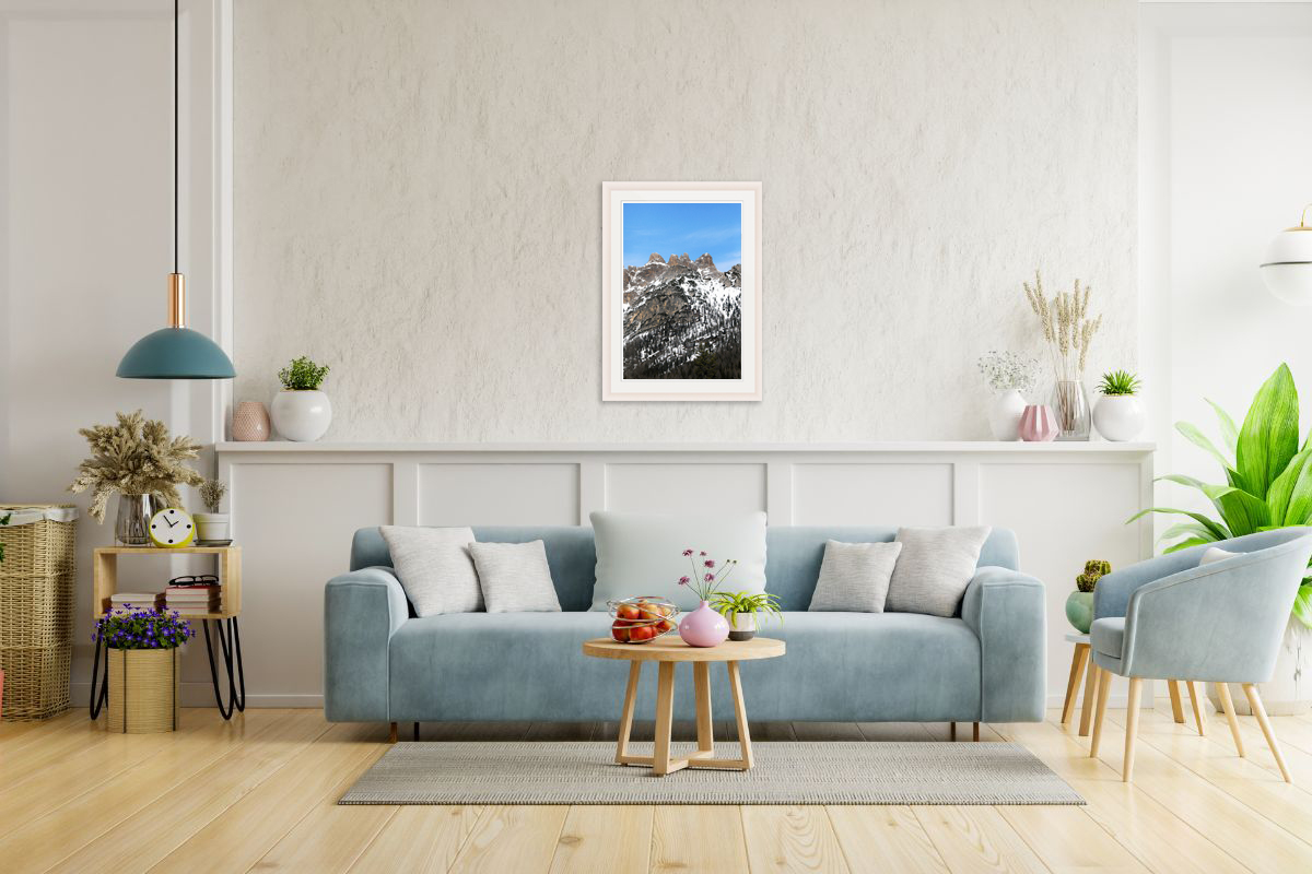 Of all the possible figures we can find in nature, mountains are exceptional. They show curious silhouettes and figures that get our imagination flowing. Stopping for a moment to observe this image can unleash so much inspiration and admiration. The shape of the mountains reaching up to the sky and the river of snow and pine trees flowing down conveys harmony and tranquility. This artistic shot was taken by Photographer and Digital Artist, Scott Allen Wilson in the Dolomites, Italy. It has been realized on Hahnemühle FineArt Pearl paper and mounted with a natural white passe-partout. The mounted print is displayed underneath a matte float glass and surrounded by a beautiful white solid wood frame. All elements of this finished product were carefully chosen to transmit the beauty of nature.