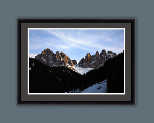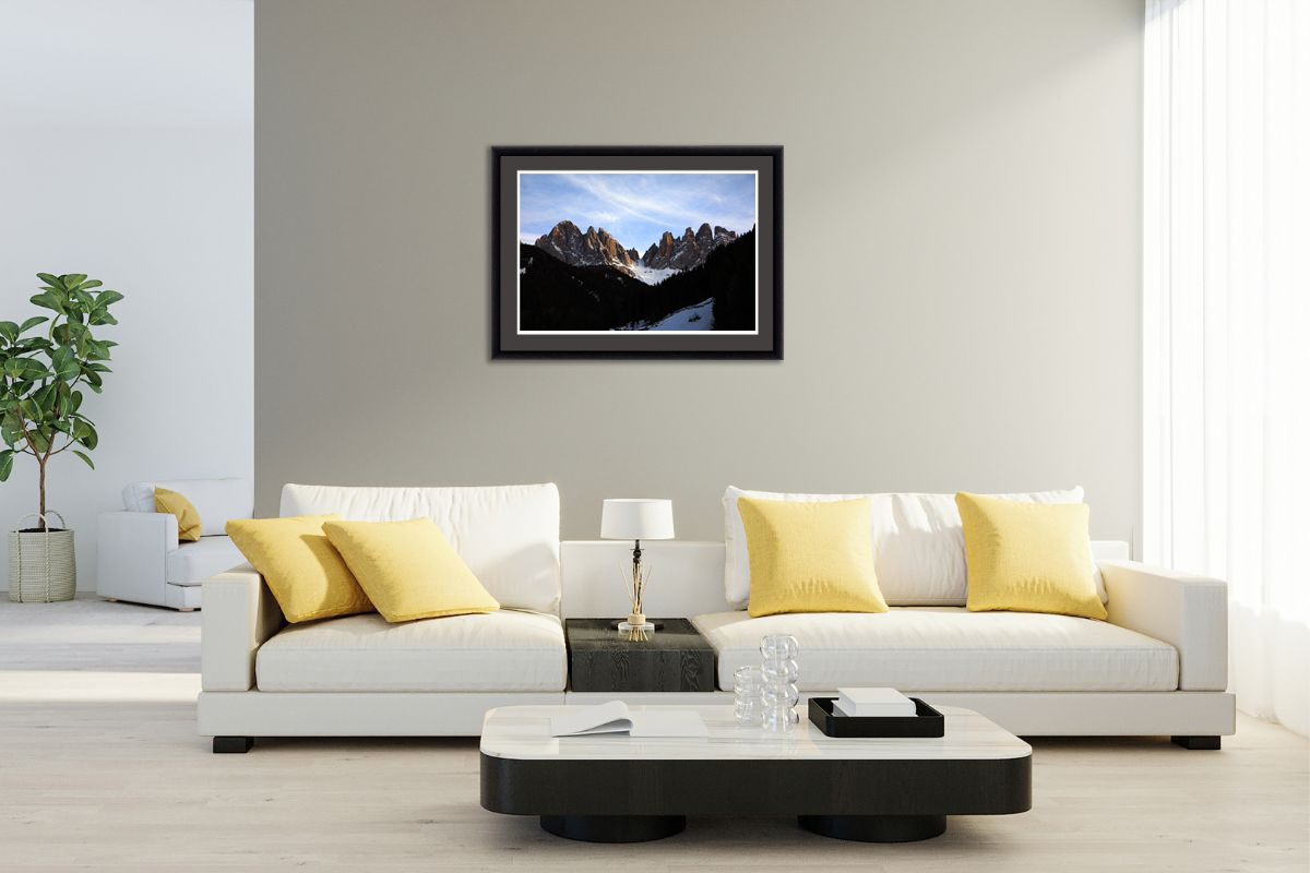 Framed by clouds and trees the mountain peaks break to let in a snow path that guides to the unknown. The uncertainty and curiosity that this photograph provokes makes it the kind of piece that inspires, that makes you get lost in the image for a moment. This unique piece taken by Photographer and Digital Artist, Scott Allen Wilson, will be able to give meaning to any room while filling it with beauty and charm. The print has been realized on Hahnemühle FineArt Pearl paper and mounted with an anthracite passe-partout. The mounted print is displayed underneath a matte float glass and surrounded by a beautiful ebony solid wood frame. Every element of this print has been carefully chosen to transport the viewer to the Dolomites, Italy.