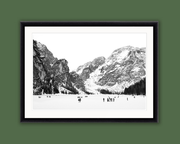 Families, friends, couples, all fascinated admiring the pale mountain rage that surrounds them. The white snow covers Lake Di Braies like a white blanket framing the mountains along with the bright white sky. This stunning photo, captured by Photographer and Digital Artist, Scott Allen Wilson, showcases the beautiful Dolomites in Italy. This white landscape is sure to make you feel like you’ve been transported to a dreamlike atmosphere. The print has been realized on Hahnemühle FineArt Pearl paper and mounted with a bright white passe-partout. The mounted print is displayed underneath a matte float glass and surrounded by a beautiful ebony solid wood frame. These elements were picked mindfully to deliver the beauty and power of nature to your room.