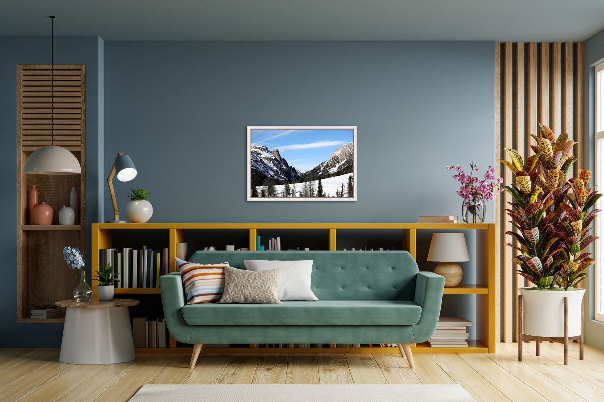 The snow covers the ground like a blanket of white perfection. As the warm sunlight appears over the mountains, their jagged peaks become a landscape of winter wonderland! This moving landscape was captured by Photographer and Digital Artist, Scott Allen Wilson in the Dolomites, Italy. This piece of art provides you with an opportunity to admire mother nature’s true beauty from the comfort of your home. The print has been realized on glossy Fuji Crystal Archive paper and mounted beneath acrylic glass. The mounted print is surrounded by a beautiful white natural oak floater frame. Whether it’s hung on a wall or leaning on a shelf, this stunning landscape will give any room a touch of magnificence and wonder.