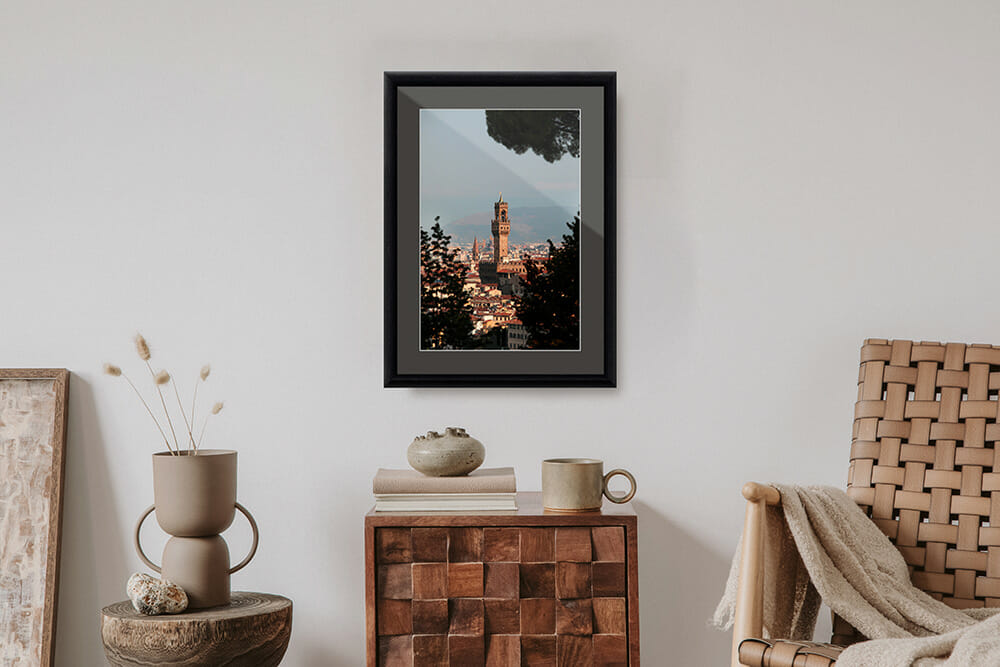 The Palazzo Vecchio, towers over the historical center Florence with its warm terracotta tones that cover the city’s buildings. We are able to catch this intimate view of the city during the golden hour, watching from beyond a frame of trees that allows us to enjoy the magic of discovering this mysterious glimpse of beauty. This image captured by Photographer and Digital Artist, Scott Allen Wilson, is the perfect piece to mount when looking for a magical environment. The print has been realized on Hahnemühle FineArt Pearl paper, and mounted with an anthracite passe-partout. It is displayed underneath a matte float glass, and surrounded by a beautiful ebony solid wood frame. Every element of this piece was individually selected with intention as being a part of a unified piece of art.