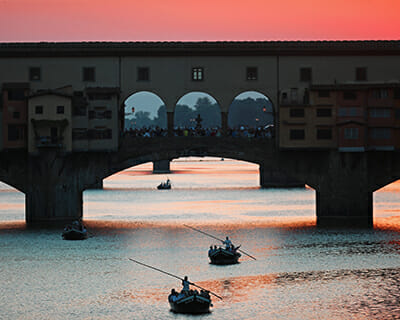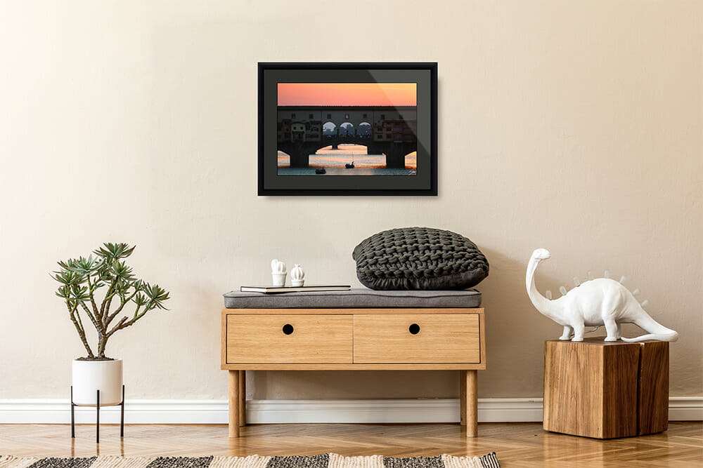 The sun sets over Ponte Vecchio, creating a dreamy reflection of light pink and orange on the waters of the Arno river. The colors and composition of this beautiful print by Photographer Scott Allen Wilson make it look like a painting. Bring this magical piece of Florence, Italy, to your home. The print has been realized on Hahnemühle FineArt Pearl paper, and has been mounted with a black passe-partout. The mounted print is displayed underneath a matte float glass, and surrounded by a beautiful ebony solid wood frame. Every element of this piece was individually selected with intention as being a part of a unified piece of art.