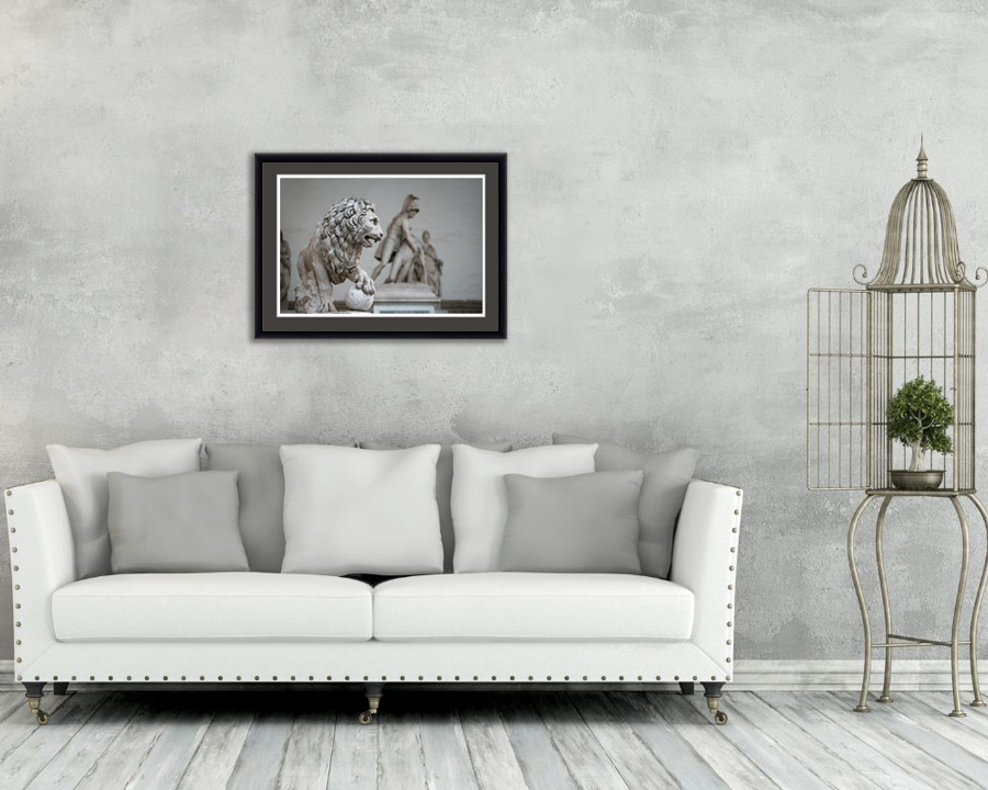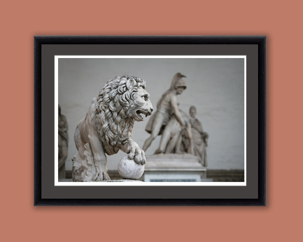 One of the sculptural masterpieces in Piazza Della Signoria is the lion monument that transmits the greatness of Loggia dei Lanzi. The elegance and virtuosity of this sculpture fit in a classic or vintage decoration. Take a look at the inspiration design in the gallery! This artistic photograph was captured in Florence, Italy by Photographer and Digital Artist, Scott Allen Wilson. The print has been realized on panchromatic Ilford B&W paper, and has been mounted with an anthracite passe-partout. The mounted print is displayed underneath a matte float glass, and surrounded by a beautiful ebony solid wood frame. Every element of this piece was individually selected with intention as being a part of a unified piece of art.