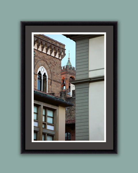 A peek of the tower of Palazzo Vecchio emerging between buildings in Piazza Della Repubblica. The pastel aquamarine colors combine beautifully with the dark bricks gives a feeling of peace and tranquility. This print, with its lines and patterns, is a perfect decoration to give a modern touch to your spaces. This artistic photograph was captured in Florence, Italy by Photographer and Digital Artist, Scott Allen Wilson. The print has been realized on Hahnemühle FineArt Pearl paper, and has been mounted with an anthracite passe-partout. The mounted print is displayed underneath a matte float glass, and surrounded by a beautiful ebony solid wood frame. Every element of this piece was individually selected with intention as being a part of a unified piece of art.