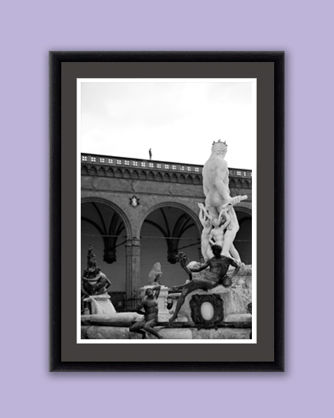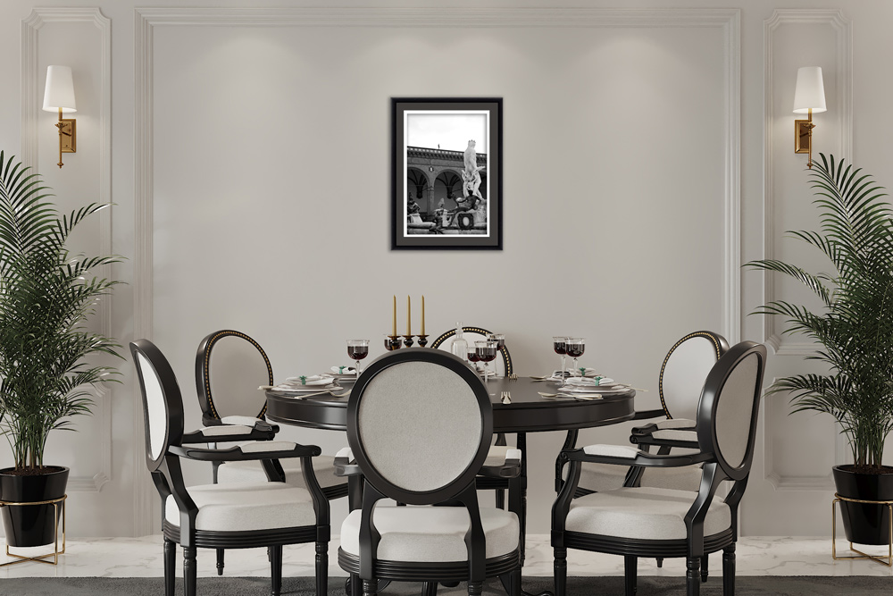 This black and white photo of the fountain of Neptune was taken in Florence, Italy by Photographer and Digital Artist, Scott Allen Wilson. Looking over the rest of the statues in Piazza Della Signoria, the Lord of the Sea shows its power and majesty in this classic and elegant print. This framed print is ready to give some meaning of greatness to your elegant living room! The print has been realized on panchromatic Ilford B&W paper, and has been mounted with an anthracite passe-partout. The mounted print is displayed underneath a matte float glass, and surrounded by a beautiful ebony solid wood frame. Every element of this piece was individually selected with intention as being a part of a unified piece of art.