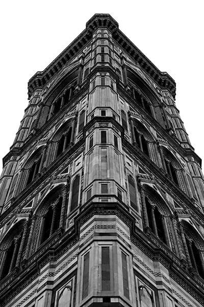 The Campanile di Giotto in Florence, Italy, is captured from a low angle. The perspective and composition of this artistic print by Photographer Scott Allen Wilson, transmit the grandiosity of the historical building and soothes our eye with its symmetry. The print has been realized on panchromatic Ilford B&W paper, and has been mounted with an anthracite passe-partout. This black and white photograph is displayed underneath a matte float glass and surrounded by a beautiful ebony solid wood frame. Every element was carefully selected to portray the intention of this piece of art.