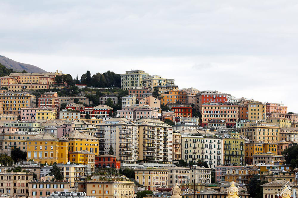 Genova’s famous multicolored buildings almost seem to flow down the hillside like a bouquet of colorful flowers. How the light dances across the pastels and deeper-tones highlights the geometric patterns. Actually, from this vantage point, the hillside seems like a stage where color, light, and architecture perform together.