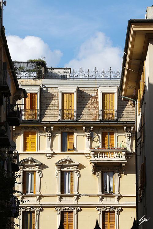 This classic residential building reflects the light of the midday sun. Maybe the window shutters are yellow to emphasize that brightness as much as possible. It’s certainly eye-catching for those that happen to gaze upon it. The tiny balconies and framed windows, should provide a vantage point into what lies behind, but on this day they remain tightly closed. Leaving us to imagine the secrets it holds.