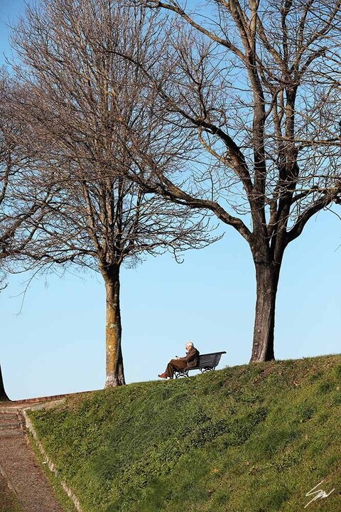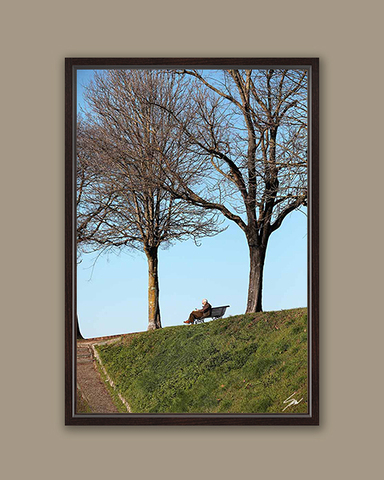 In Lucca, Italy, an old man reads alone, sitting on a bench between two trees. We become witnesses of a beautiful moment where a connection with nature is forged, and the ordinary becomes a source of pure joy. This framed print is a reminder that life’s most precious moments often reside in the simplicity of our everyday experiences. The print has been realized on glossy Fuji Crystal Archive paper, and mounted beneath acrylic glass. The mounted print is surrounded by a beautiful solid wood frame. Every element of this piece was individually selected with intention as being a part of a unified piece of art.