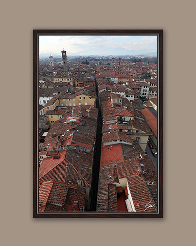 A bird’s-eye view of Lucca, showcasing a sea of red rooftops and the city’s principal bell towers. The view is divided by a long street, inviting you to contemplate the charming cityscape from a whole new perspective. This print is sure to add an interesting touch to any space. The print has been realized on glossy Fuji Crystal Archive paper, and mounted beneath acrylic glass. The mounted print is surrounded by a beautiful solid wood frame. Every element of this piece was individually selected with intention as being a part of a unified piece of art.