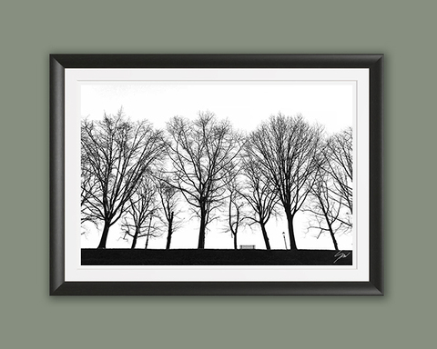 Walking around Lucca, Italy, you find yourself lost in this spooky park. The looming trees, the lonely bench, and the slender lamppost, enhanced by the black and white, create an atmosphere of mystery and solitude. Perfect for those who appreciate a touch of macabre, this framed print adds a captivating and enigmatic vibe to any space. The print has been realized on Hahnemühle FineArt Pearl paper, and has been mounted with a bright white passe-partout. The mounted print is displayed underneath a matte float glass, and surrounded by a beautiful ebony solid wood frame. Every element of this piece was individually selected with intention as being a part of a unified piece of art.
