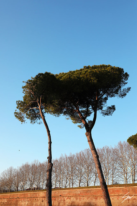 In Lucca, Italy, the symbolism of two trees joined together at their fronds. While they remain vibrant, the barren trees in the background symbolize the enduring power of love and companionship that makes us stronger. The print has been realized on Hahnemühle FineArt Pearl paper, and has been mounted with a natural white passe-partout. The mounted print is displayed underneath a matte float glass, and surrounded by a beautiful ebony solid wood frame. Every element of this piece was individually selected with intention as being a part of a unified piece of art.