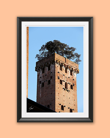 Explore the harmonious coexistence of architecture and nature with Torre Guinigi in Lucca, Italy. This print exudes a poetic and serene atmosphere, bringing the enchanting beauty of Lucca into your home. The print has been realized on Hahnemühle FineArt Pearl paper, and has been mounted with a natural white passe-partout. The mounted print is displayed underneath a matte float glass, and surrounded by a beautiful ebony solid wood frame. Every element of this piece was individually selected with intention as being a part of a unified piece of art.
