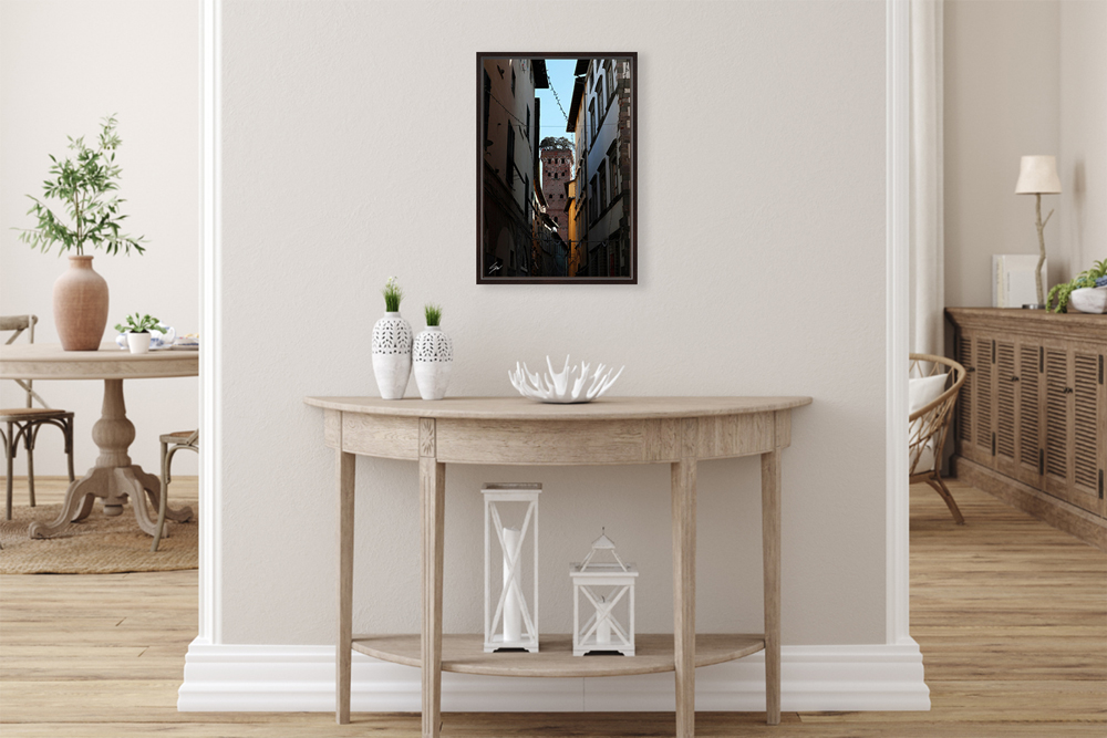 Lucca’s most treasured gem: a tower unlike any other in Italy. Torre Guinigi, adorned with trees on top of it, appears at the end of a charming street, offering a majestic view of the cityscape that transports you directly to Lucca. The print has been realized on glossy Fuji Crystal Archive paper, and mounted beneath acrylic glass. The mounted print is surrounded by a beautiful solid wood frame. Every element of this piece was individually selected with intention as being a part of a unified piece of art.