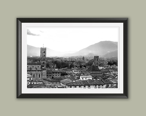 Lucca, Italy is a never ending pleasure for your eye. The more you look at its buildings and streets, the more you notice details that you hadn’t noticed before. This framed print of Lucca, showcasing its beauty from above, will be a window to Italy directly into your spaces. The print has been realized on Hahnemühle FineArt Pearl paper, and has been mounted with a bright white passe-partout. The mounted print is displayed underneath a matte float glass, and surrounded by a beautiful ebony solid wood frame. Every element of this piece was individually selected with intention as being a part of a unified piece of art.