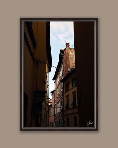 Experience the picturesque view of Italy’s traditional rooftops in Lucca. The harmonious way in which these rooftops complement each other is an ode to the city’s architectural charm. It’s not just a print; it’s a testament to the enduring beauty of Lucca. Elevate your room with this stunning print. The print has been realized on glossy Fuji Crystal Archive paper, and mounted beneath acrylic glass. The mounted print is surrounded by a beautiful solid wood frame. Every element of this piece was individually selected with intention as being a part of a unified piece of art.