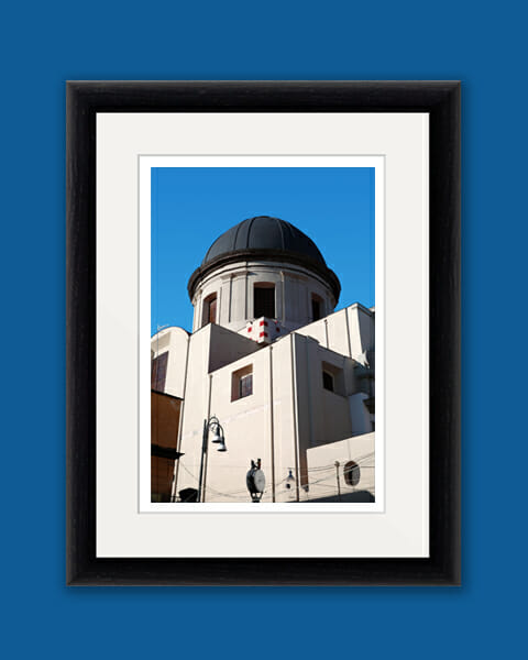 In contrast to a clear and intense blue sky, is a minimalist building highlighted in the center of the image. This artistic photograph was captured in Naples, Italy by Photographer and Digital Artist, Scott Allen Wilson. The print has been realized on Hahnemühle FineArt Pearl paper, and has been mounted with a natural white passe-partout. The mounted print is displayed underneath a matte float glass, and surrounded by a beautiful ebony solid wood frame. Every element of this piece was individually selected with intention as being a part of a unified piece of art.