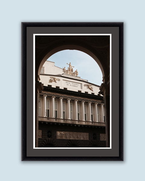 Photographer and Digital Artist, Scott Allen Wilson, frames with an arch, the Real Teatro di San Carlo located in Naples, Italy. This beautiful architectural masterpiece turns this print into a sophisticated art piece that can contribute to any classic decoration style. The print has been realized on Hahnemühle FineArt Pearl paper, and has been mounted with an anthracite passe-partout. The mounted print is displayed underneath a matte float glass, and surrounded by a beautiful ebony solid wood frame. Each element of this print was carefully and intentionally chosen to create a piece worthy of adorning any environment.