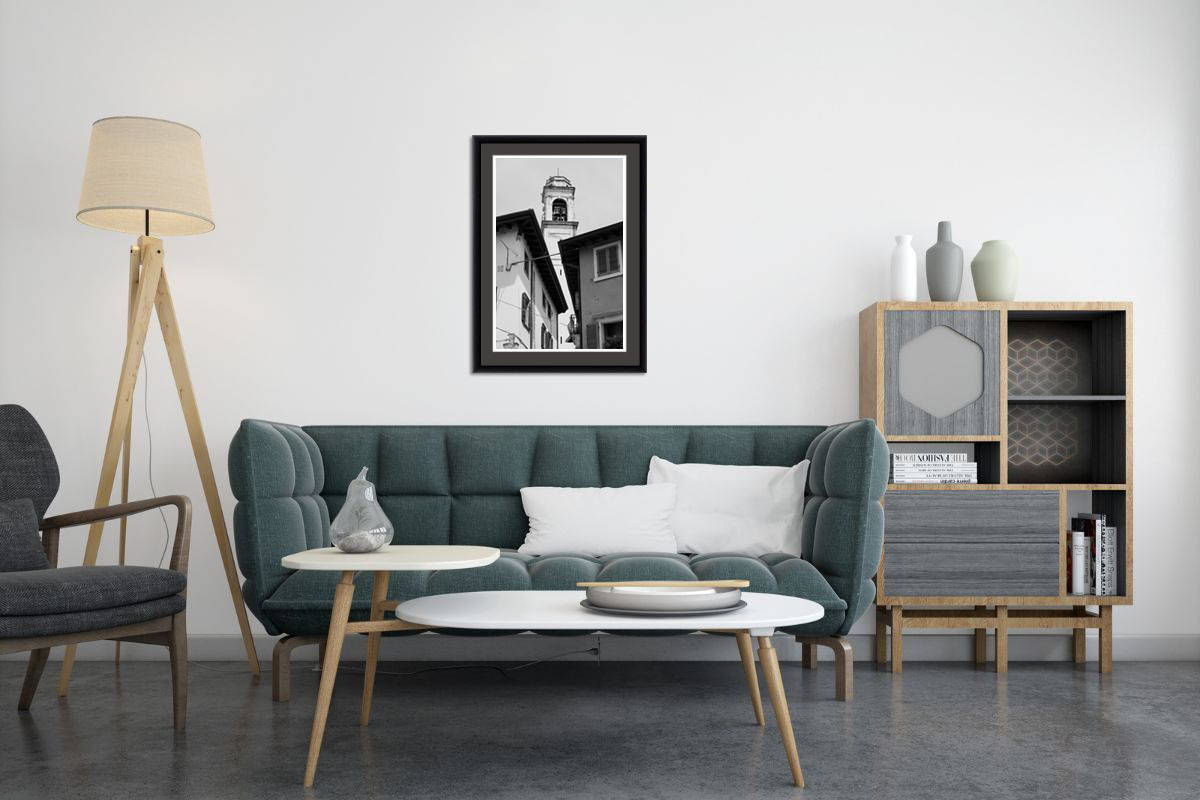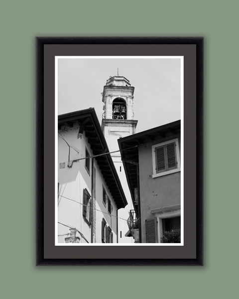 This stunning black and white framed print captures the narrow streets and enchanting atmosphere of Lazise, Italy from a low angle. Taken by Photographer and Digital Artist Scott Allen Wilson, the image shows two buildings framing a bell tower in the back. The monochromatic palette enhances the dramatic texture and contrasting shades of the buildings, evoking a sense of mystery. The composition brings a classy touch to any room, perfectly balancing contemporary and traditional styles. The print has been realized on Hahnemühle FineArt Pearl paper and mounted with an anthracite passe-partout. The mounted print is displayed underneath a matte float glass and surrounded by a beautiful ebony solid wood frame. It is a captivating work of art that will add a touch of elegance and sophistication to modern decoration!