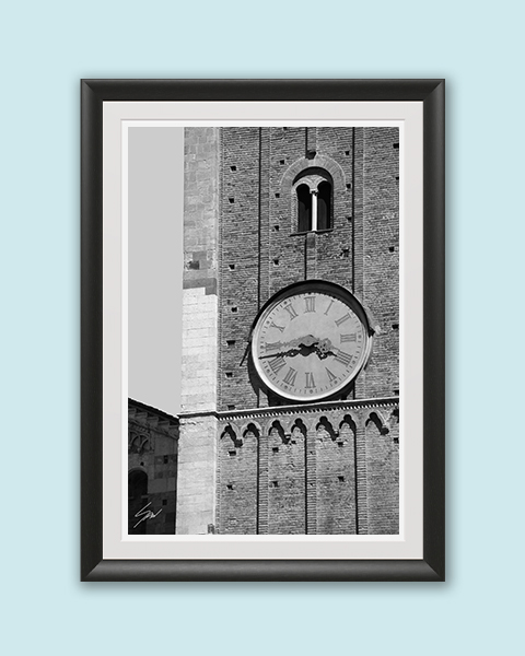 A Black and White version of this print surely accentuates the features of this fascinating building: looking at the clock tower of Palazzo del Governatore, in Parma, you will find that time suddenly stands still. The slender tower, on which is mounted a fine clock, reigns sovereign over Piazza Garibaldi. There is something so majestic yet mysterious in that clock, that has been towering over centuries of history. The print has been realized on Hahnemühle FineArt Pearl paper and mounted with a natural white passe-partout. The mounted print is displayed underneath a matte float glass and surrounded by a beautiful ebony solid wood frame. Every element of this piece was individually selected with intention as being a part of a unified piece of art.