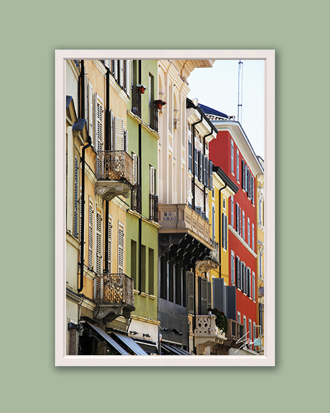 Immerse yourself in the vibrant charm of Parma’s colorful houses as they line the streets like a harmonious symphony of hues. If you are looking for a print to light up your spaces, stop looking! This print evokes a sense of warmth and joy that transports you to a place where time seems to slow down, and the world feels a little brighter. The print has been realized on glossy Fuji Crystal Archive paper and mounted beneath acrylic glass. The mounted print is surrounded by a beautiful white solid wood floater frame. All the elements in this composition were carefully picked to create the perfect print that transports you to Parma.