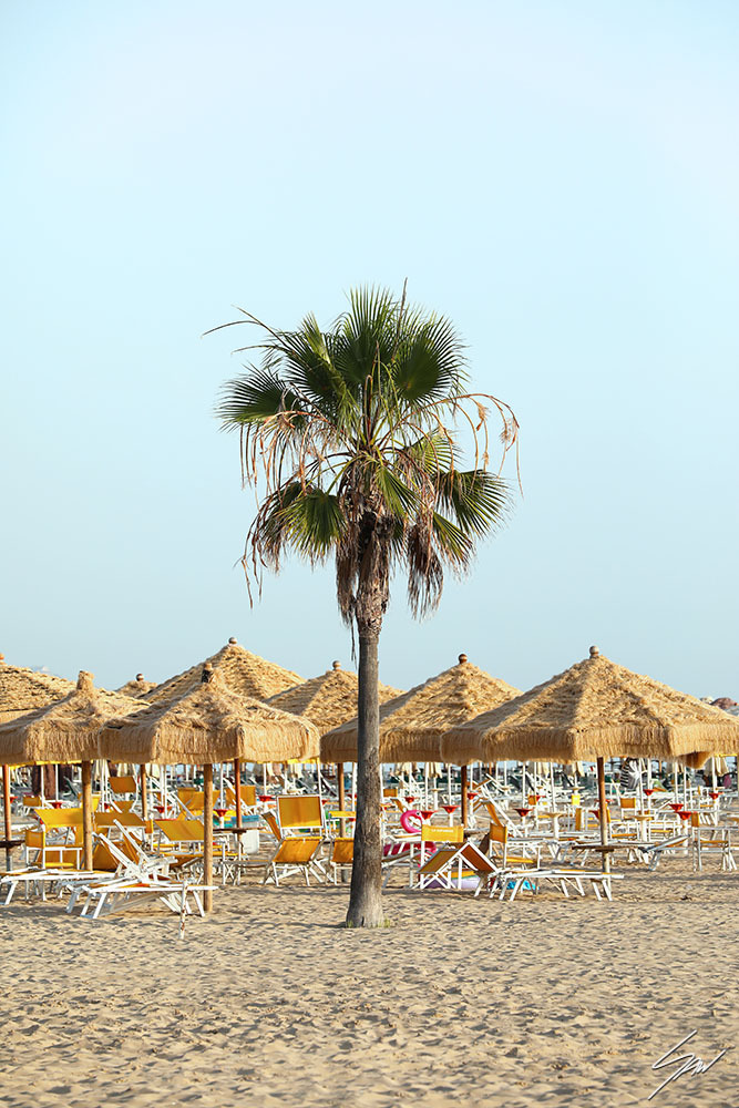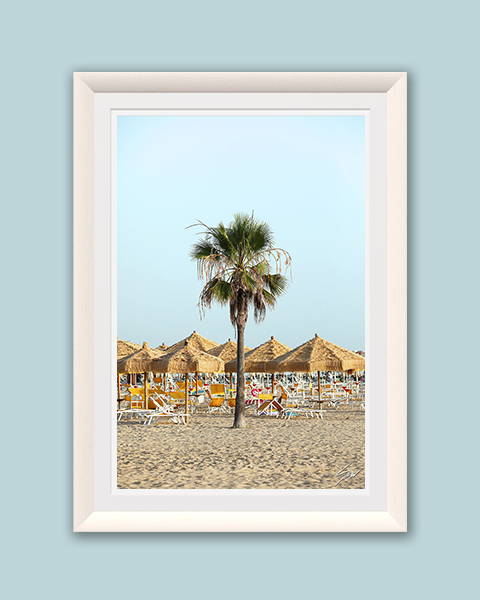 Feel the tranquility of Italian Summer with this print of the beach in Pescara, Italy. Picture yourself under the shade of lush palm trees, gently swaying in the marine breeze. Straw sun umbrellas invite you to relax as you soak in the sun and enjoy this seaside escape. Add this print of the beach in Pescara to your collection as a keepsake of summer with you all year long. The print has been realized on Hahnemühle FineArt Pearl paper, and has been mounted with a natural white passe-partout. The mounted print is displayed underneath a matte float glass, and surrounded by a beautiful white solid wood frame. All the elements in this composition were carefully picked to create the perfect print that transports you to Pescara.