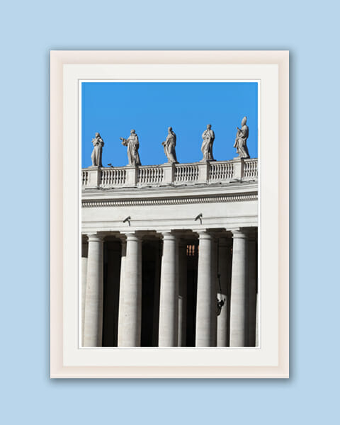 This picture taken by Photographer and Digital Artist Scott Allen Wilson in Rome, Italy portrays the symmetric columns and detailed gargoyles of St. Peter’s Basilica located at St. Peter’s Square in the Vatican City. The clear blue sky and the white stone combine perfectly to form a classic and stylish piece. The print has been realized on Hahnemühle FineArt Pearl paper, and has been mounted with a natural white passe-partout. The mounted print is displayed underneath a matte float glass, and surrounded by a beautiful white solid wood frame. Every element of this piece was individually selected with intention as being a part of a unified piece of art.
