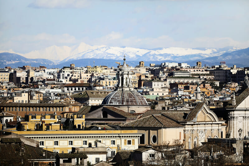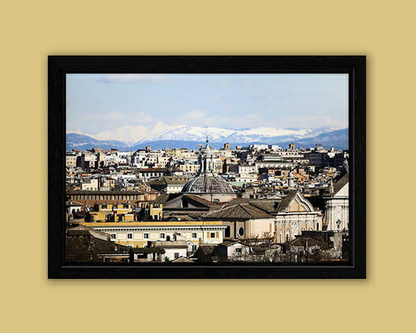 Beautiful landscape view of the city of Rome, Italy highlighting its churches and monuments with mountains covered with snow in the background. This photo was taken by Digital Artist and Photographer Scott Allen Wilson. The print has been realized on Hahnemühle FineArt Pearl paper. The mounted print is displayed underneath a matte float glass, and surrounded by a beautiful solid wood frame. Every element of this piece was individually selected with intention as being a part of a unified piece of art.