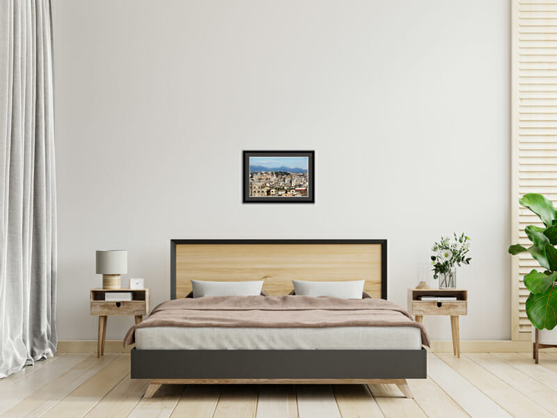 Beautiful landscape view of the city of Rome, Italy portraying its clear pastel colors that provide such a relaxing sensation. This photo was taken by Digital Artist and Photographer Scott Allen Wilson. The print has been realized on Hahnemühle FineArt Pearl paper, and has been mounted with an anthracite passe-partout. The mounted print is displayed underneath a matte float glass, and surrounded by a beautiful ebony solid wood frame. Every element of this piece was individually selected with intention as being a part of a unified piece of art.