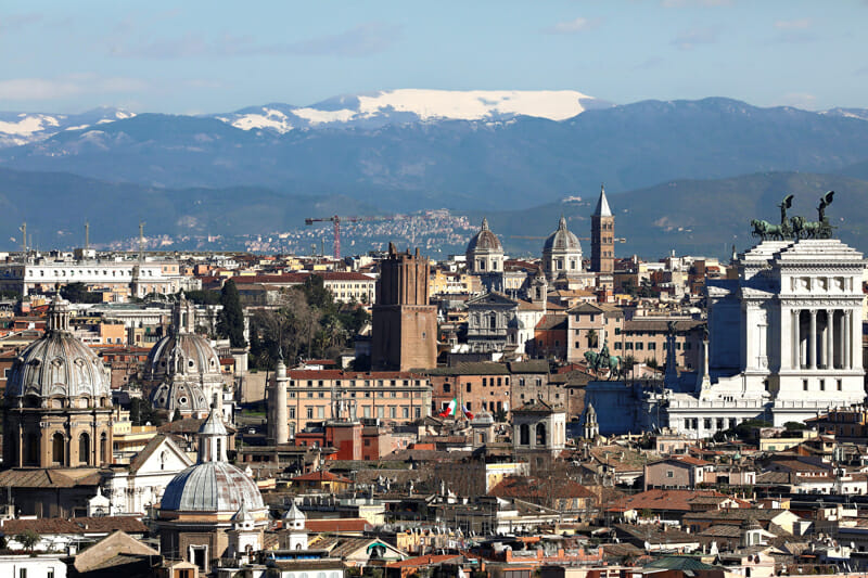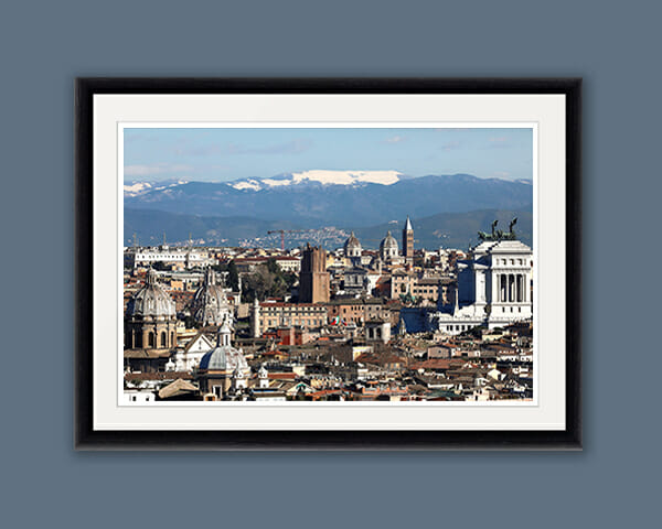 Beautiful landscape view of the city of Rome, Italy highlighting its churches and monuments with snowy mountains in the background. This photo was taken by Digital Artist and Photographer Scott Allen Wilson. The print has been realized on Hahnemühle FineArt Pearl paper, and has been mounted with a natural white passe-partout. The mounted print is displayed underneath a matte float glass, and surrounded by a beautiful ebony solid wood frame. Every element of this piece was individually selected with intention as being a part of a unified piece of art.