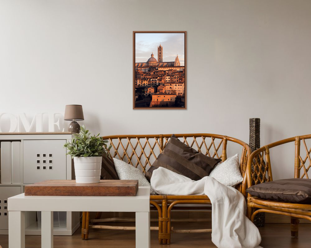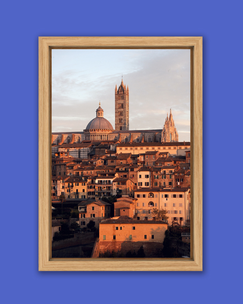 One of the most popular shots of Photographer Scott Allen Wilson was taken in Siena, Italy. This unique landscape view of Siena with beautiful earthy terracotta colors is given by an obscure hidden spot on a hill. The Cathedral of Siena on top overviews the rest of the city that goes down the hill like a waterfall. This print has been realized on glossy Fuji Crystal Archive paper and mounted beneath acrylic glass. The mounted print is surrounded by a beautiful solid natural oak frame. Every element of this piece was individually selected with the intention of being a part of a unified piece of art.