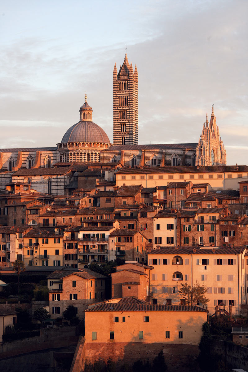 Siena is a medieval hilltown located in the Tuscany region of Italy. It is known for its well-preserved historical center, rich cultural heritage, and stunning architecture. Siena has a long and fascinating history, dating back to the Etruscan era. The city reached its height of prosperity in the Middle Ages and was a major center of commerce, art, and culture. It is renowned for its well-preserved medieval architecture, which includes Gothic palaces, churches, and public squares. The most famous of these is Piazza del Campo, a large shell-shaped square that is the site of the annual Palio horse race. Leaving the city center you can see a beautiful view of the city – especially at sunset which you can see depicted here 🙂