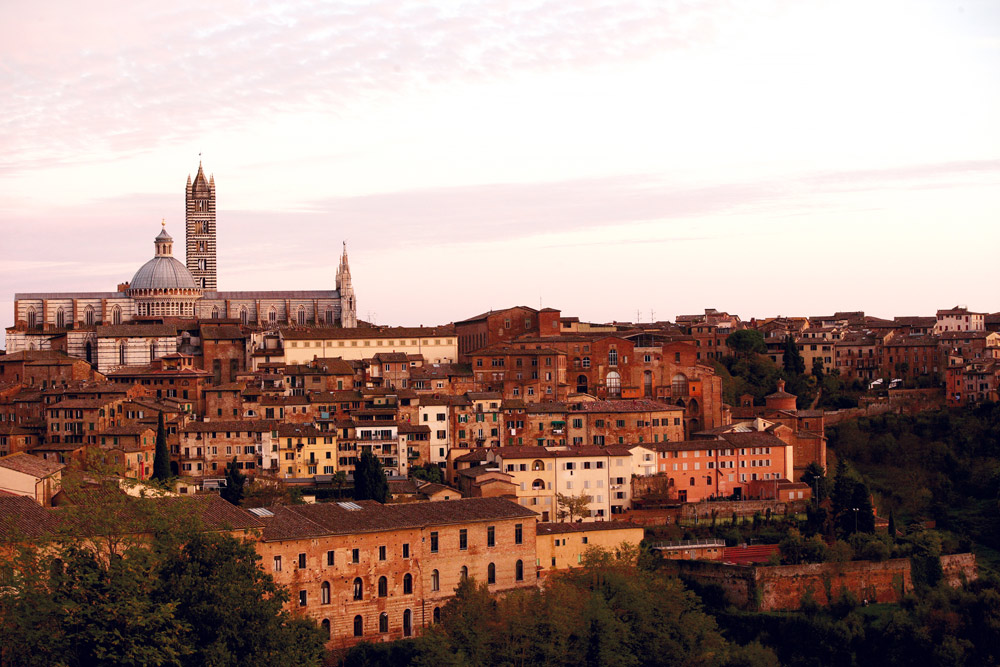 Siena, Italy is a city located in the heart of Tuscany and is surrounded by rolling hills and picturesque countryside. From a nearby hill, the city presents a breathtaking panoramic view.