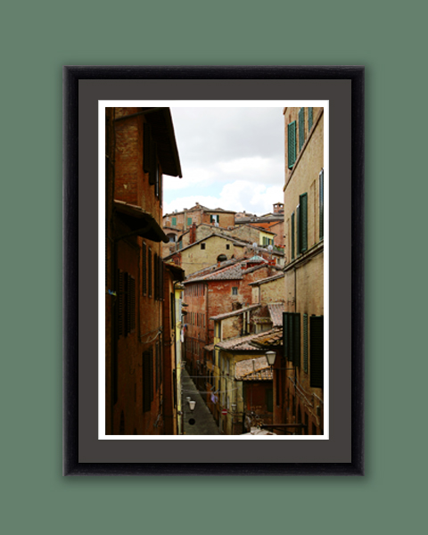 Photographer Scott Allen Wilson shows the roof tops of a medieval street in Siena, Italy. The narrow street guides the view to the top of the hill walking through the path of medieval town houses. This print can contribute to a decoration in warm colors. It has been realized on Hahnemühle FineArt Pearl paper and mounted with an anthracite passe-partout. The mounted print is displayed underneath a matte float glass and surrounded by a beautiful ebony solid wood frame. Every element of this piece was individually selected with the intention of being a part of a unified piece of art.