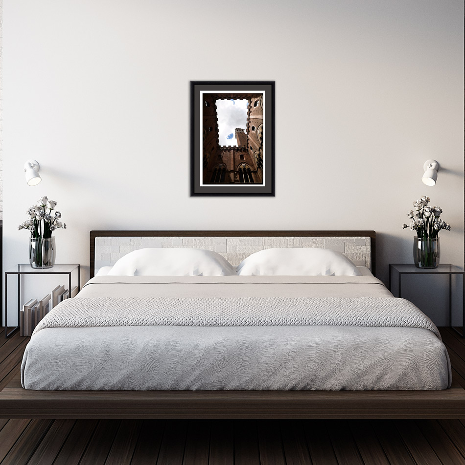 The tall brick structure of Palazzo Pubblico rises to the sky that covers Piazza del Campo, one of Siena’s richest cultural spaces that holds the most important events of the year. The geometrical composition of this shot can adorn any modern space with a traditional Italian building. This artistic photograph was taken by Photographer and Digital Artist, Scott Allen Wilson, in Siena, Italy. It has been realized on Hahnemühle FineArt Pearl paper and mounted with an anthracite passe-partout. The mounted print is displayed underneath a matte float glass and surrounded by a beautiful ebony solid wood frame. Every element of this piece was individually selected with the intention of being a part of a unified piece of art.