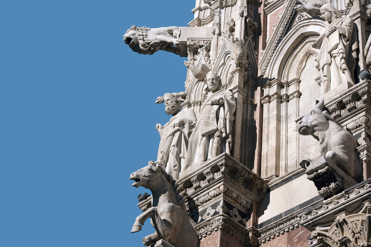 The left side of the facade of the Duomo in Siena, Italy is filled with a series of sculptural reliefs that depict scenes from the life of Christ, as well as allegorical figures and other religious symbols. These reliefs were created by master sculptors such as Jacopo della Quercia and Giovanni Pisano, and are considered to be some of the finest examples of Gothic sculpture in Italy.