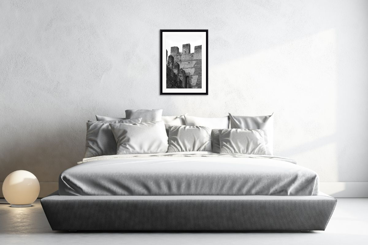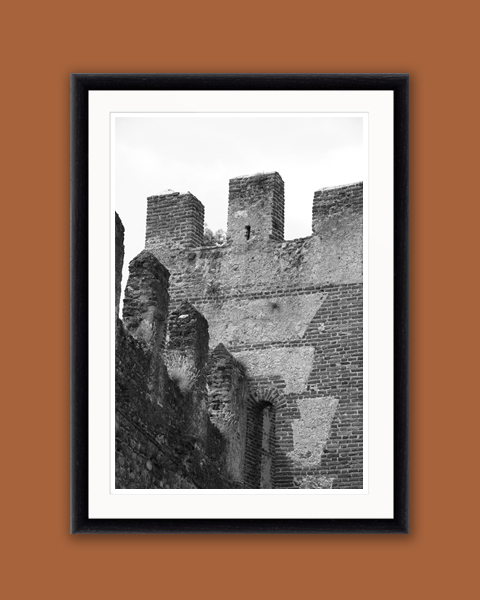 This stunning black-and-white photo captures the intricate details of Castello Scagliero di Lazise’s medieval architecture. The sharp edges and straight angles of the building’s design create a mesmerizing display of geometric shapes. Photographer and Digital Artist, Scott Allen Wilson, captures the essence of this castle’s historic beauty through his lens. Each stone placed with precision over centuries of construction is highlighted in stark contrast against the light background, creating a cinematic atmosphere bound to fascinate the viewer. The print has been realized on Hahnemühle FineArt Pearl paper and mounted with a bright white passe-partout. The mounted print is displayed underneath a matte float glass and surrounded by a beautiful ebony solid wood frame. Photography lovers will be captivated by this unique piece of architecture.