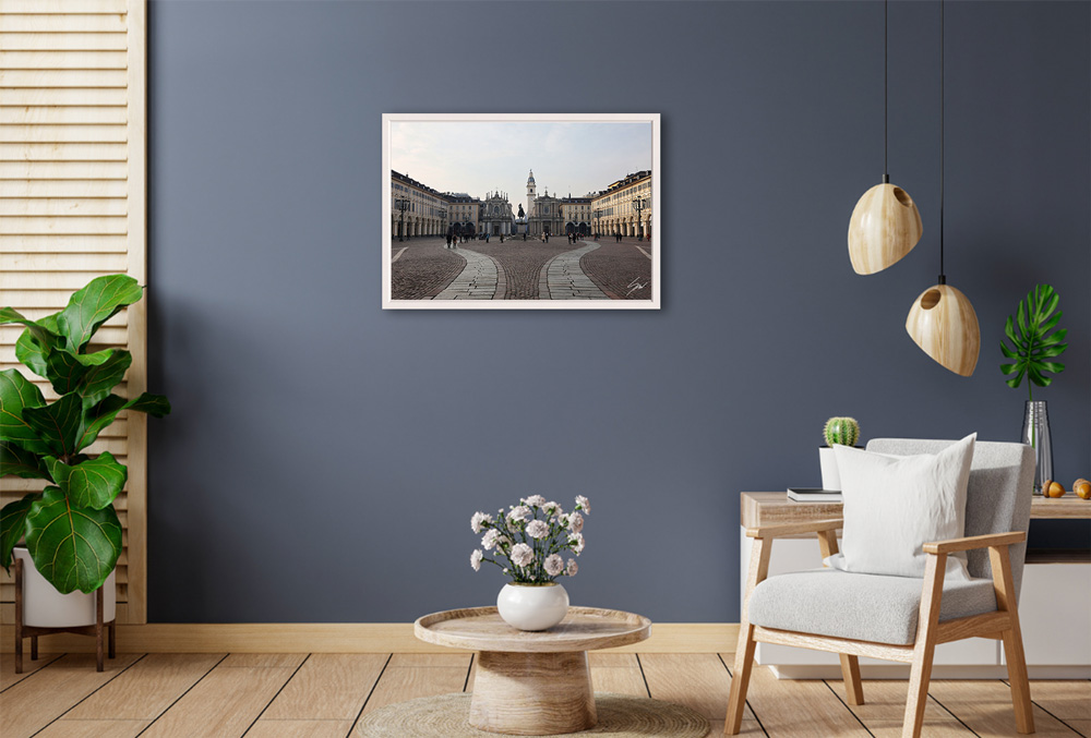 A view of San Carlo square in Torino, Italy, caught in all its calm and elegance. Enrich your spaces by opening a window on beautiful Torino straight into your home. The print has been realized on glossy Fuji Crystal Archive paper and mounted beneath acrylic glass. The mounted print is surrounded by a beautiful white natural oak floater frame. All the elements in this composition were carefully picked to create the perfect print that transports you to Torino.