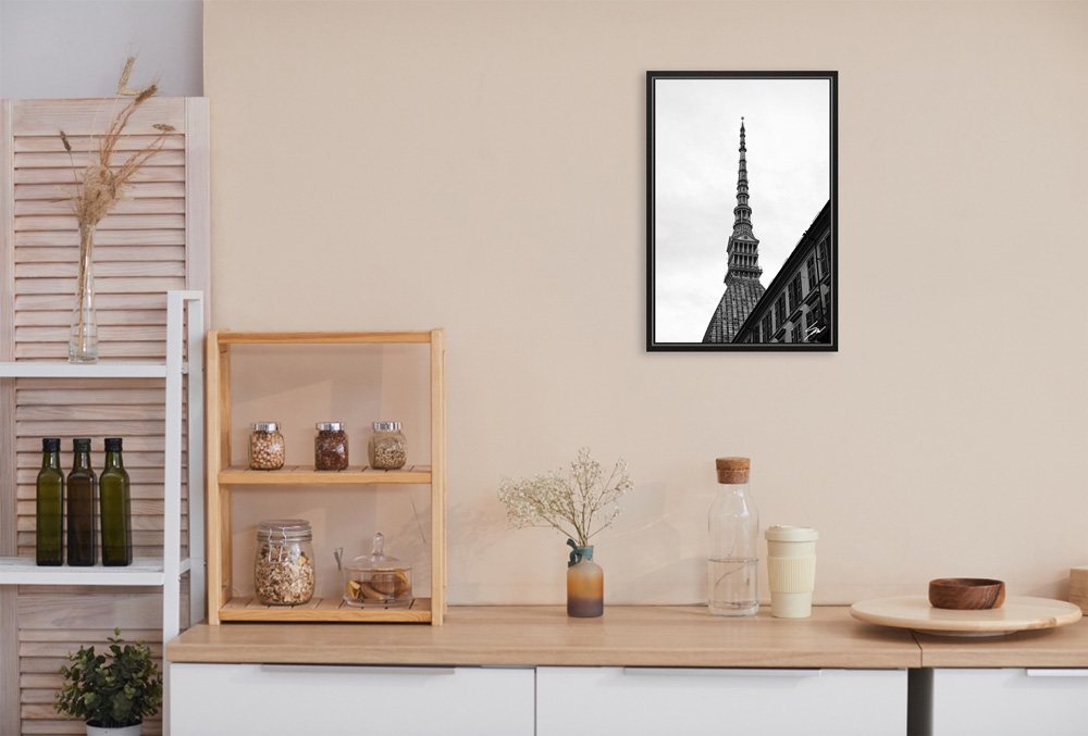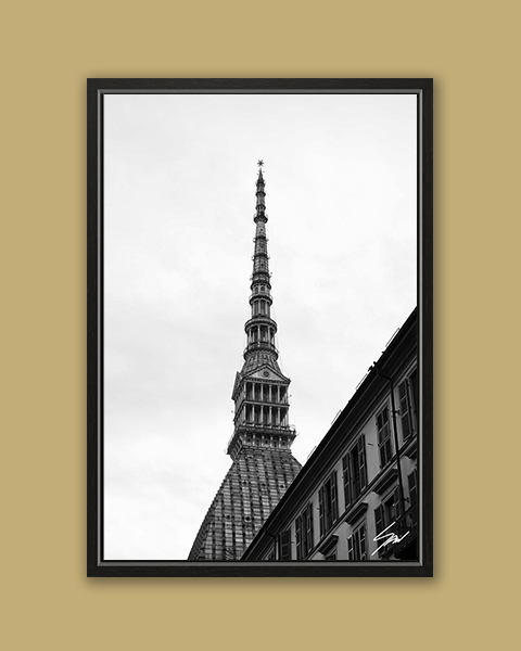 The dome of the Mole Antonelliana towers over the city of Torino, Italy. The dramatic b&w enhances its details and transports you to another world. The print has been realized on glossy Fuji Crystal Archive paper, and mounted beneath acrylic glass. It is displayed underneath a matte float glass, and surrounded by a beautiful black oak floater frame. Every element of this piece was individually selected with intention as being a part of a unified piece of art.