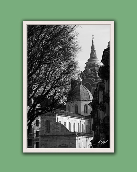 A moving B&W shot of the iconic Holy Shroud Chapel in Torino, Italy. The branches of a tree complement its silhouette without covering it: a proof that nature and art can coexist beautifully. This print has been realized on glossy Fuji Crystal Archive paper, and mounted beneath acrylic glass. The mounted print is surrounded by a beautiful white solid wood frame. Every element of this piece was individually selected with intention as being a part of a unified piece of art.