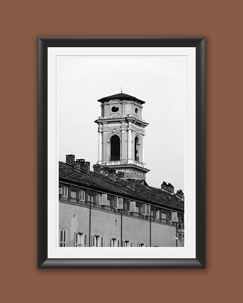 The architecture in Torino, Italy, never ceases to amaze. Its fine details are caught by Photographer Scott Allen Wilson in this dramatic B&W shot. The print has been realized on Hahnemühle FineArt Pearl paper, and has been mounted with a bright white passe-partout. The mounted print is displayed underneath a matte float glass, and surrounded by a beautiful ebony solid wood frame. Every element of this piece was individually selected with intention as being a part of a unified piece of art.