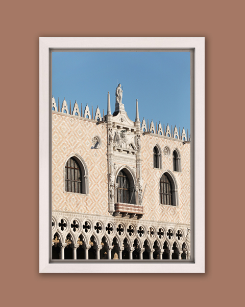 This amazing architectural print was taken by Photographer and Digital Artist, Scott Allen Wilson, who portrays the Doge’s Palace in Venice, Italy, and provides a close shot in order to appreciate the details and patterns of its composition. This print can give luminosity to any environment plus a touch of elegance that goes with almost all kinds of decorations. This artistic print has been realized on glossy Fuji Crystal Archive paper, and mounted beneath acrylic glass. The mounted print is surrounded by a beautiful white floater frame. Every part of this work of art was thought out carefully to deliver a decorative piece that will add with beauty and meaning to your room.