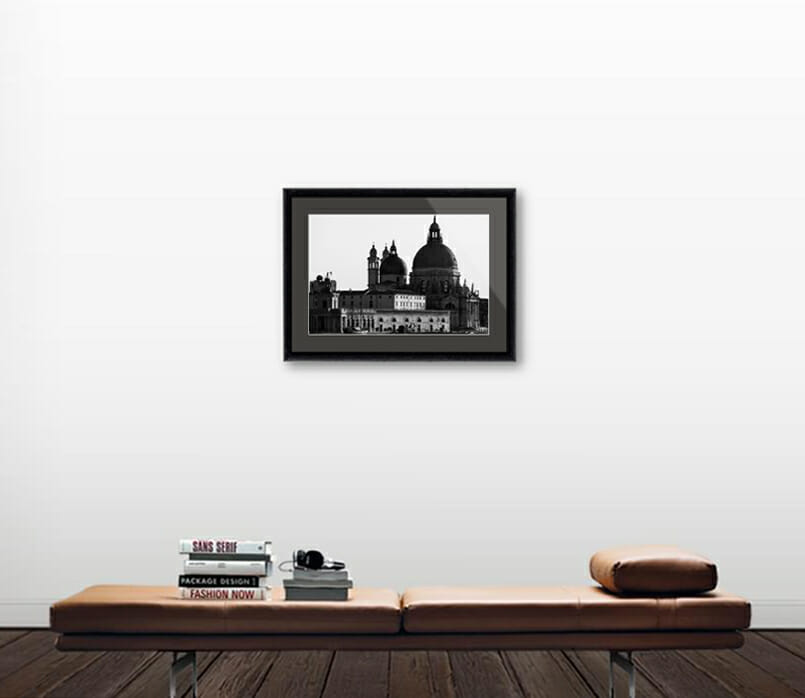 Black and white photo of Santa Maria Della Salute in Venice, Italy by Photographer Scott Allen Wilson. The dome of the cathedral makes us appreaciate the inmensity of this structurem and the black and white shades are perfect to decorate any bright color wall! The print has been realized on panchromatic Ilford B&W paper, and has been mounted with an anthracite passe-partout. The mounted print is displayed underneath a matte float glass, and surrounded by a beautiful ebony solid wood frame. All elements of this framed print are expressly chosen to provide you with a finished work of art that can transport you to this beautiful city every day.