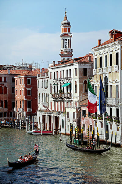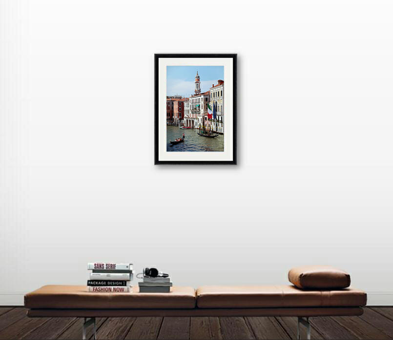 A photo of gondolas on the Grand Canal in Venice, Italy by Photographer Scott Allen Wilson. The gondolas with an Italian flag, plus the pastel colors of the buildings in the background, reflecting on the water perfectly portray the spirit of this amazing city. This print can give a very classy touch to your room while transporting you to the floating city every time you stare at it! The print has been realized on Hahnemühle FineArt Pearl paper, and has been mounted with a natural white passe-partout. The mounted print is displayed underneath a matte float glass, and surrounded by a beautiful ebony solid wood frame. Each element of this print was carefully and intentionally chosen to create a piece worthy of adorning any environment.