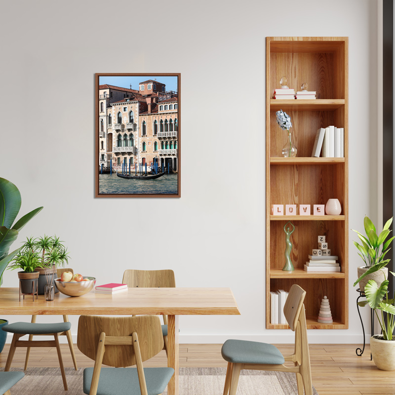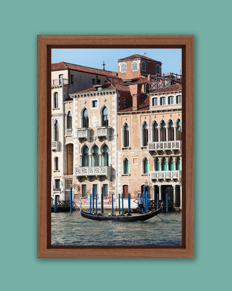 In front of beautiful Venetian buildings, a gondoliere takes protagonism as it approaches the dock. This scene is traditional to the city that has this print hanging on a wall is like one’s own window to Venice, Italy. The salmon pink and beige shades of the buildings combine pleasingly with the till windows and blue water. This artistic print was taken by Photographer Scott Allen Wilson, and has been realized on glossy Fuji Crystal Archive paper, then mounted beneath acrylic glass. Surrounded by a beautiful walnut floater frame, this print can be the perfect piece of art to relax your sight every time you look at it!